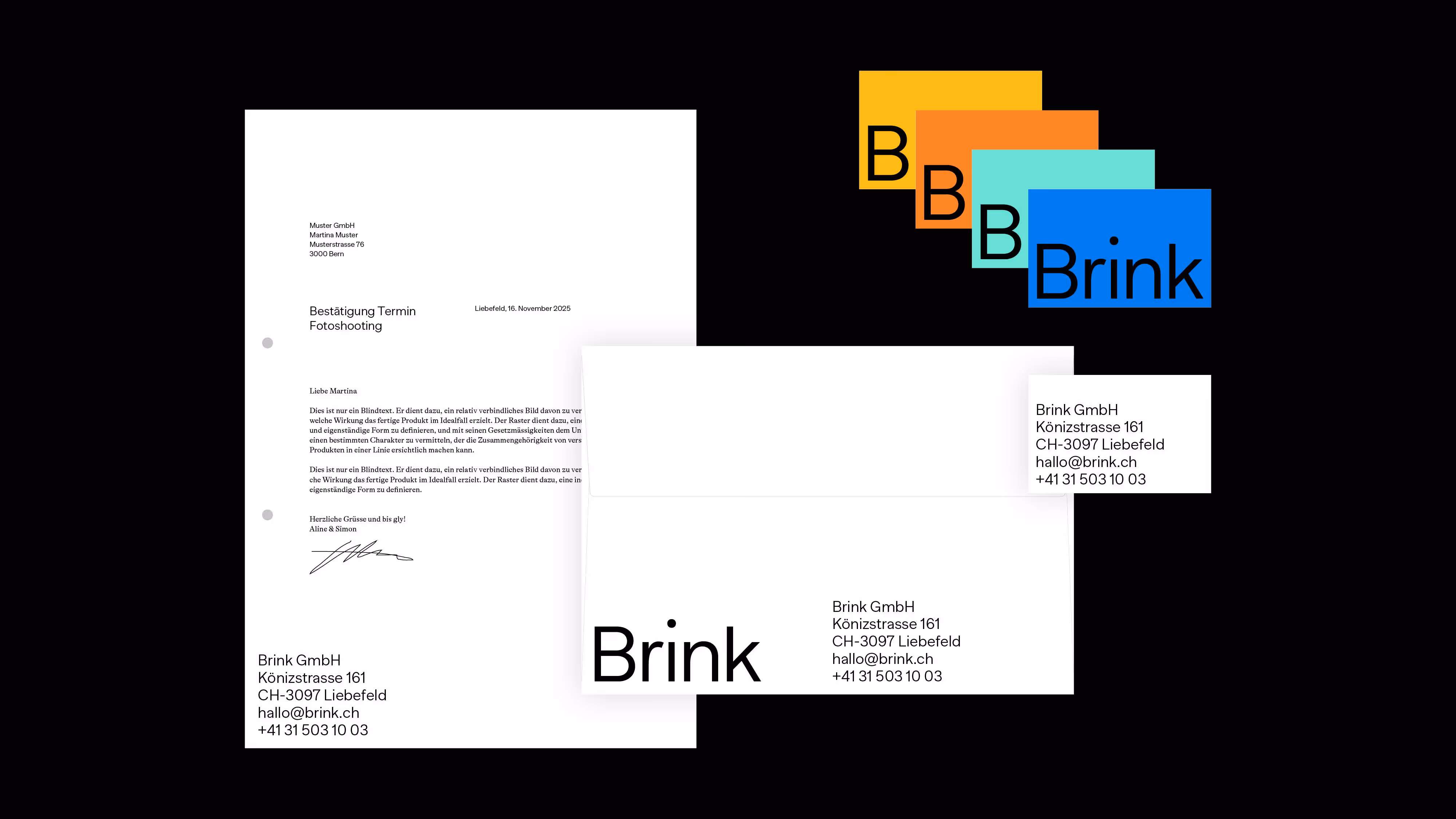 Das Logo gilt als «Siegel» und wird nur als Absender platziert, wenn das entsprechende Produkt oder Element «von Brink» ist. Es kann in Schwarz, Weiss oder den Farben aus der definierten Farbwelt von Brink zur Anwendung kommen, wobei es auf dunklen Hintergründen hell und auf hellen Hintergründen in dunkel platziert wird.